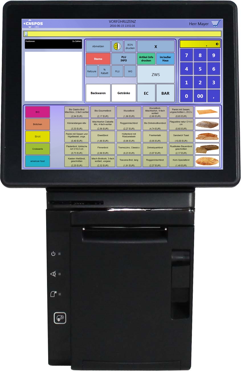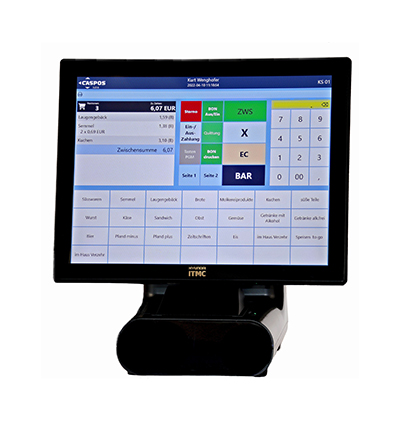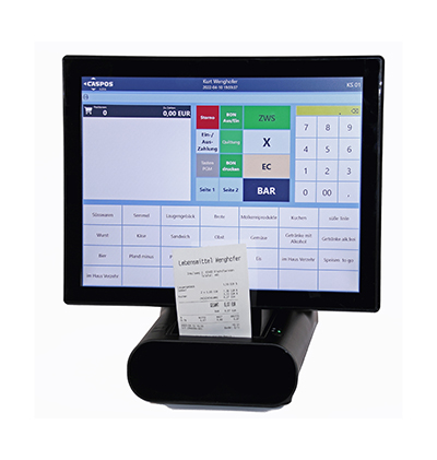 kann nach dem Bausteinprinzip, durch das Zusammensetzen verschiedener Software- und Konfigurationsmodule, Lösungen für unterschiedlichste Anwendungsfälle bereitstellen. Die Bandbreite dieser Anwendungsfälle reicht von der Einzelhandelskassebis hin zu Kundenterminals. Das CASPOS-Kassensystem Kompakt 15" bietet einen hochauflösenden und neigbaren 15" Touchmonitor, einen eingebauten Thermobondrucker 80mm, sowie eine hochwertige VGA-Kundenanzeige. Alle steuerrelevanten Finanzdaten werden automatisch gesichert und archiviert. Im Bedarfsfall kann man bei einer Kassenprüfung durch den Finanzbeamten schnell und unkompliziert die gewünschten Daten per Touchklick auf einen USB-Stick exportieren.